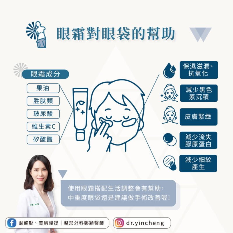 因為眼袋的成因多為眼睛肌肉或眶膈與支持韌帶(Lockwood ligament)鬆弛、皮下膠原蛋白流失、黑色素沉積,所以眼霜的成分可能有果油或其他油脂、四胜肽或其他胜肽類、玻尿酸、維生素C、矽酸鹽…等,這些成分的功能主要就是幫助眼周肌膚