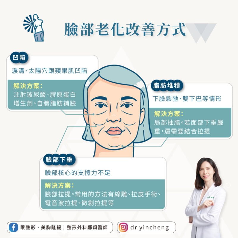 隨著醫美技術進步,針對不同的臉部老化問題,鄭醫師建議可以有以下改善方式