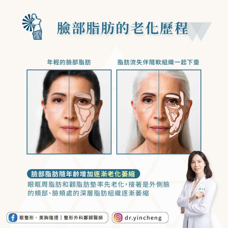 - 臉部脂肪隨年齡增加逐漸老化萎縮,眼眶周脂肪和顴脂肪墊率先老化,接著是外側臉的頰部、臉頰處的深層脂肪組織逐漸萎縮
