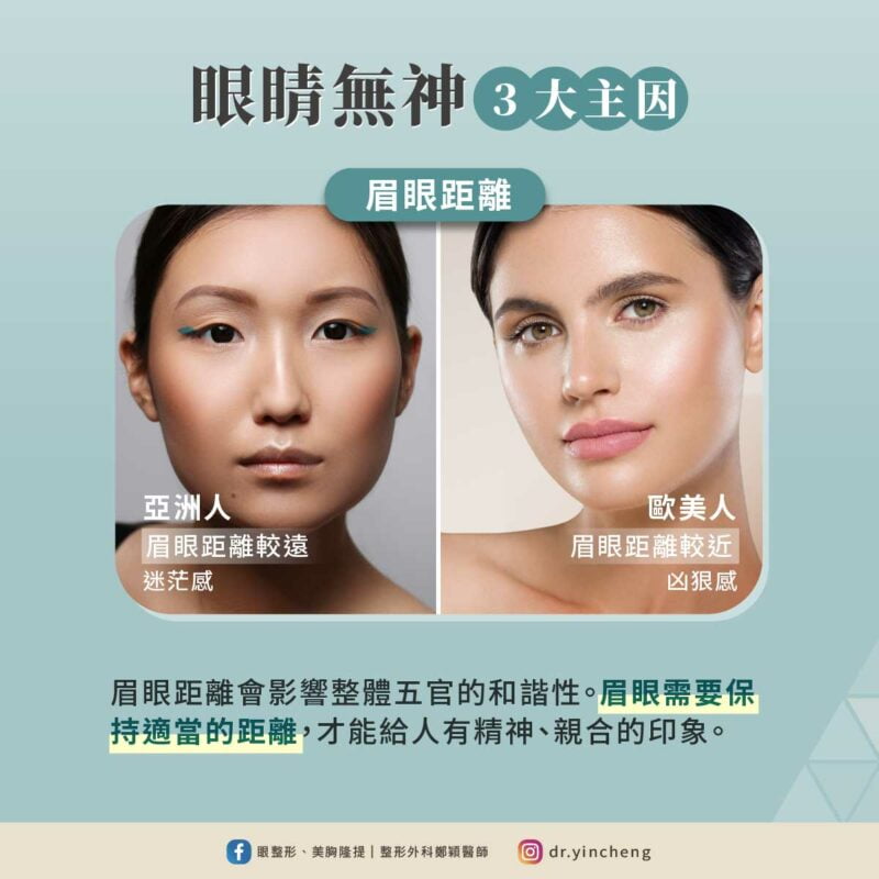 -眉眼距離:眉眼距離會影響整體五官的和諧性。亞洲人通常眉眼距離較遠,因此眼神容易給人一種「迷茫感」。而歐美人或是因為老化而眼皮下垂,眉眼距離容易過近,也會給人「眉壓眼」的凶狠感。因此眉眼需要保持適當的距離,才能給人有精神、親合的印象。