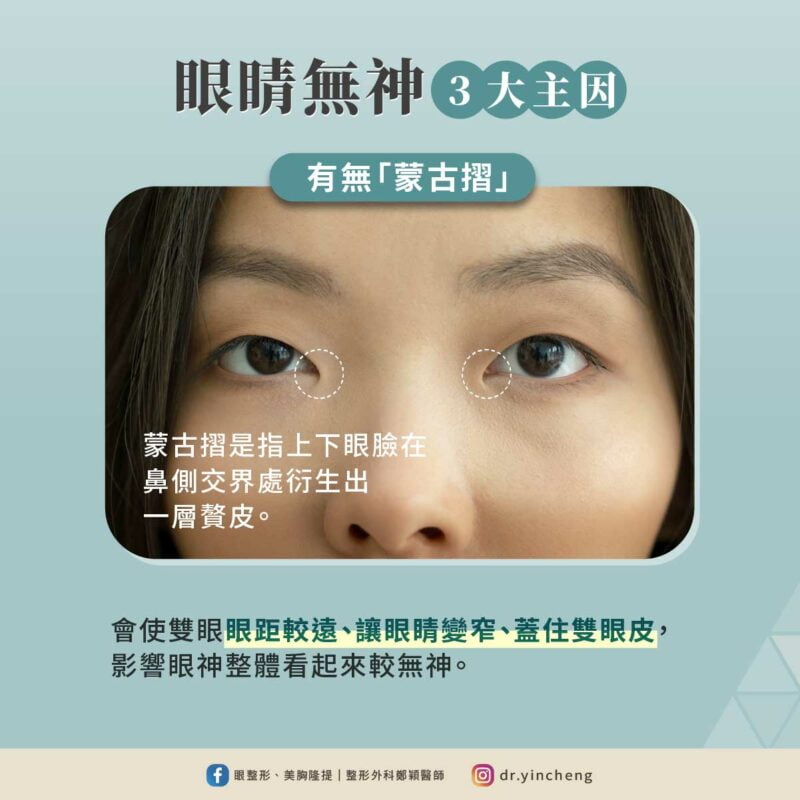 -有無「蒙古摺」:蒙古摺是指上下眼瞼在鼻側交界處衍生出一層贅皮。亞洲人約有50%的人天生就有蒙古摺。此贅皮可以防止飛塵進入眼睛,但也會使雙眼眼距較遠、讓眼睛變窄、蓋住雙眼皮,影響眼神整體看起來較無神。