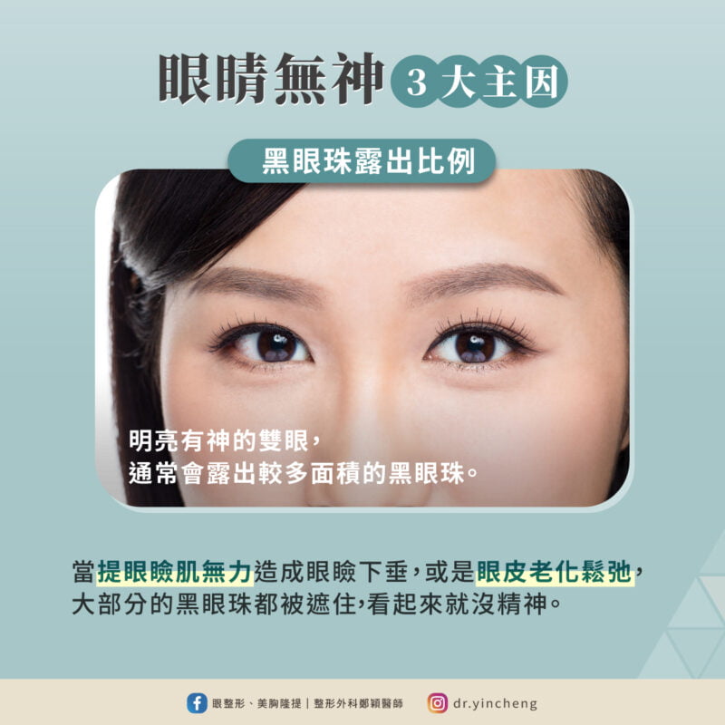 -黑眼珠露出比例:明亮有神的雙眼,通常會露出較多面積的黑眼珠。給人炯炯有神的印象。但是,當提眼瞼肌無力造成眼瞼下垂,或是眼皮老化鬆弛,使得雙眼在睜開時就無法好好地提起眼皮或是被下垂的眼皮遮蓋,大部分的黑眼珠都被遮住,看起來就沒精神。