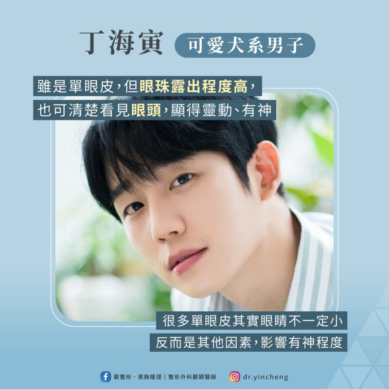 而 丁海寅 的眼睛也極具特色,他的眼型屬於半月型的細長眼型。雖然是單眼皮,但眼珠露出程度高,也可清楚看見眼頭,讓眼神顯得更靈動、有神,並流漏出一股溫柔暖意。