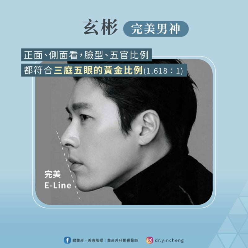 接著看玄彬 的側面,下顎角非常明顯、迷人,而鼻尖與下巴最突出的點連線起來,下唇緊貼此線條,上唇約後退2mm,可以形成一個完美的E-Line線條。因此,玄彬無論是正面、側面看,臉型、五官比例幾乎都符合完美的黃金比例,也難怪不老男神可以迷倒眾生