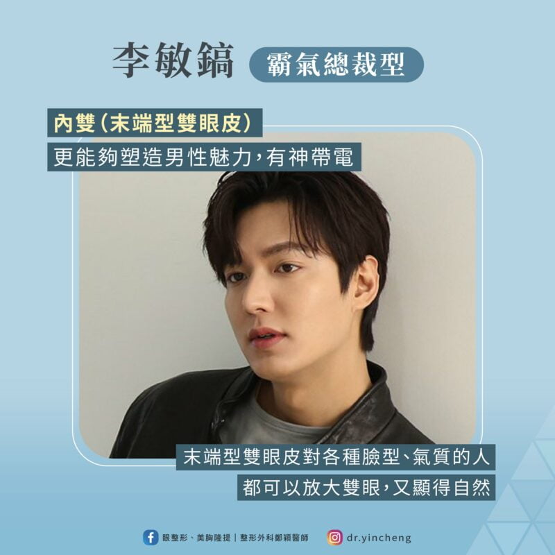 不過,仔細看 李敏鎬 的眼睛,並非歐美人常見的全開式雙眼皮,而是亞洲人較常見的內雙。而這種末端型的雙眼皮的特色是摺痕在眼睛前端不明顯,但是末端有清楚、漂亮的摺痕。