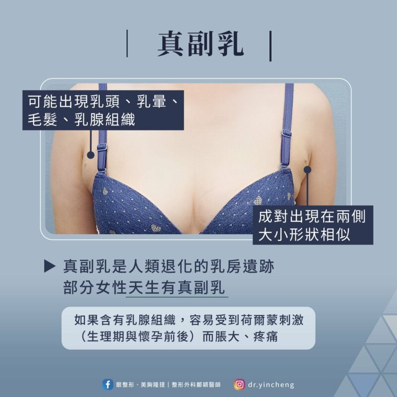 真副乳是人類退化的乳房遺跡。哺乳類在演化過程中,胚胎乳腺從腋窩下方,沿著胸部到腹股溝,都有許多乳房遺跡。隨著發育,多數人通常只剩下胸前一對乳房。但根據期刊《ePlasty》的研究統計,大約有2~6%的女性因為基因,導致退化過程不完整,產生真副乳‼