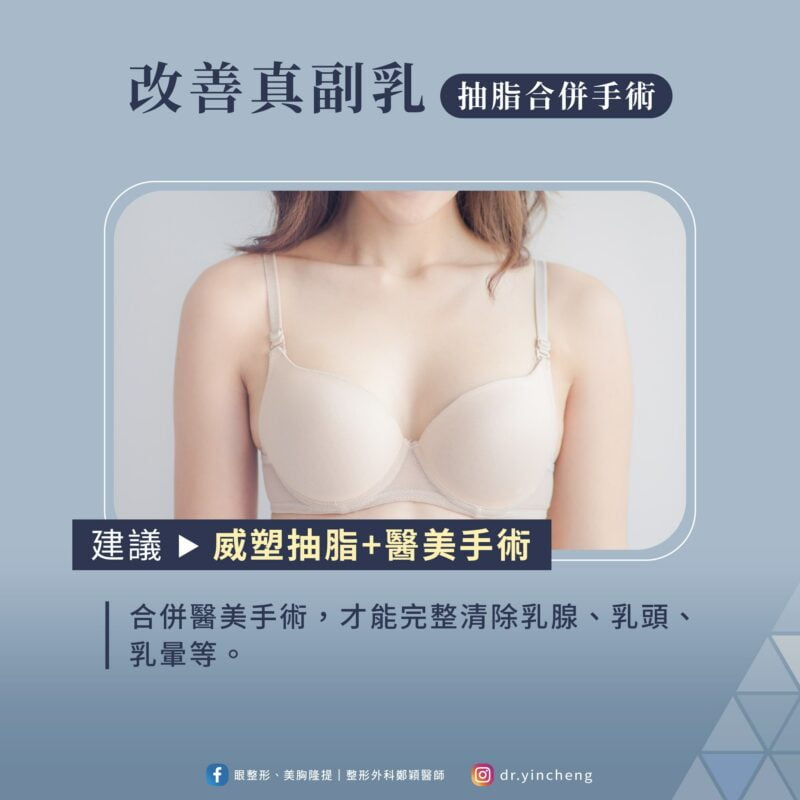 真副乳除了有脂肪組織,也可能有乳腺、乳頭、乳暈。因此除了做威塑抽脂,也要合併醫美手術,才能完整清除。如果副乳的乳頭、乳暈較明顯,或是乳腺組織較多,為了維持術後美觀,手術時鄭醫師會留意幾個要點