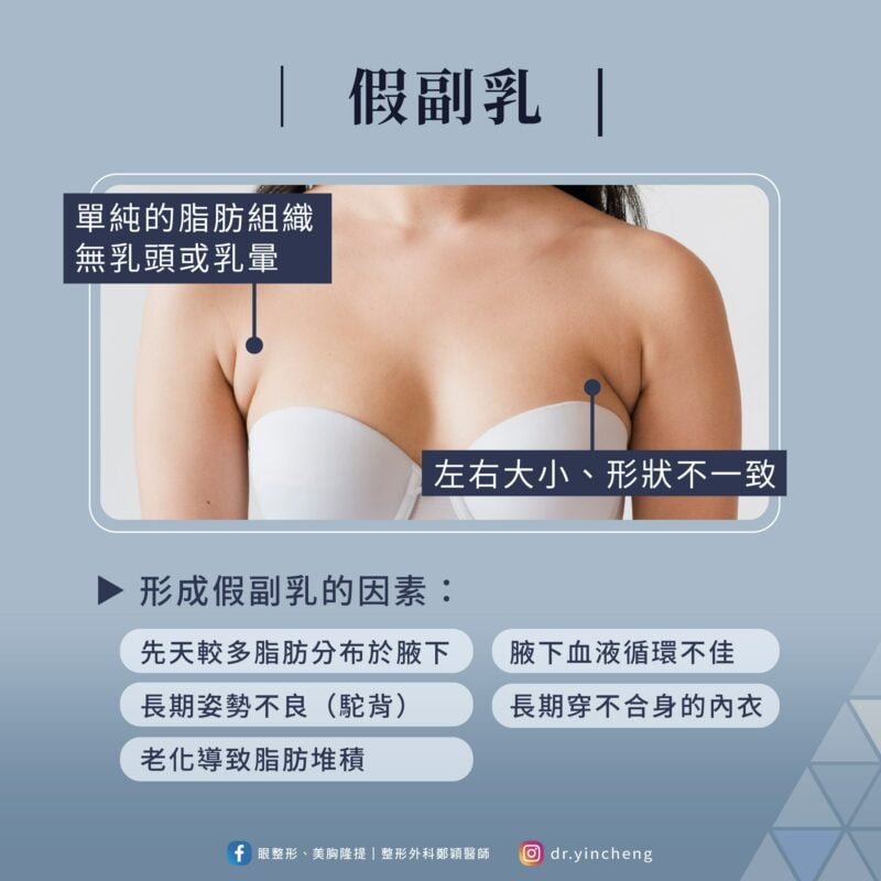 許多女性不滿副乳 ,而我們常說的副乳是指腋下擠出一團小小的肉。而這團肉其實無關體重、胸部大小,任何人都可能因先天遺傳、後天習慣影響有「副乳」而醫學上也依據其組織形成,區分出「真副乳」與「假副乳」!鄭醫師提醒,如果想消除副乳的話,還得先來確認一下你是哪種副乳,才能對症下藥喔!