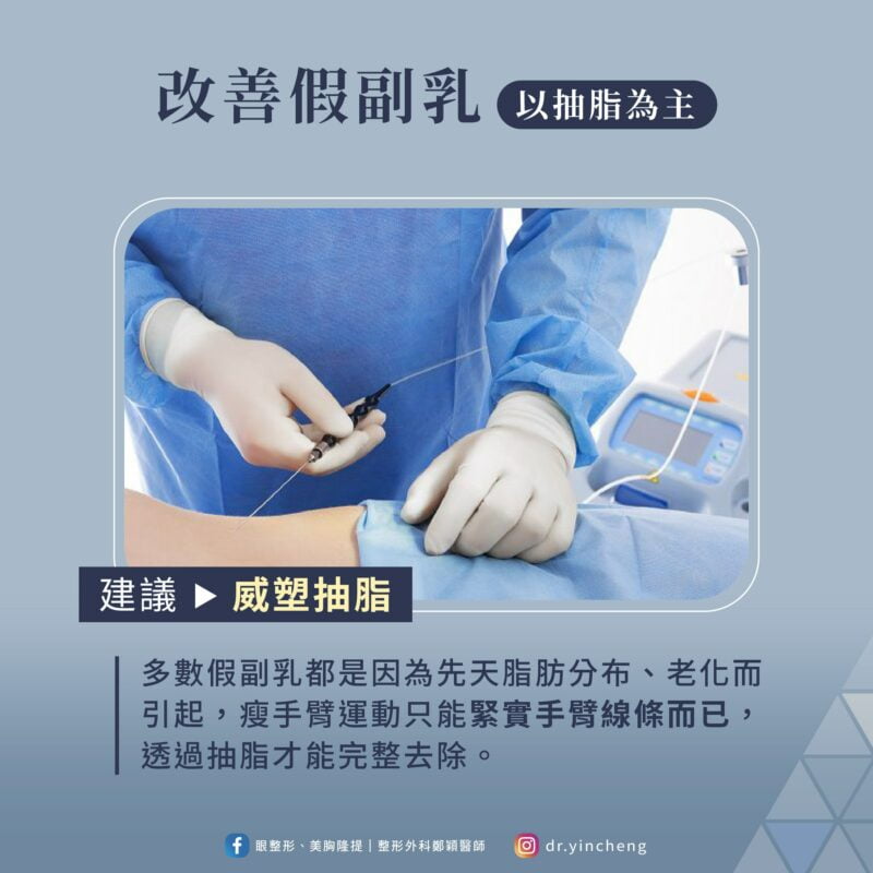 多數的假副乳都是因為先天脂肪分布、老化而引起。這種情況做再多瘦手臂運動,都沒有用辦法完全移除脂肪, 只是緊實手臂線條而已。最完整、實在的方式,還是透過「抽脂」才能去除假副乳