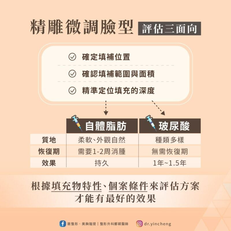 也因為2種填充物的性質不同,每個人的皮膚質地、老化情形、臉部結構也都不一樣。因此該打玻尿酸還是自體脂肪才能有最好的效果,其實需要根據填充物的特性、個案的條件來評估。