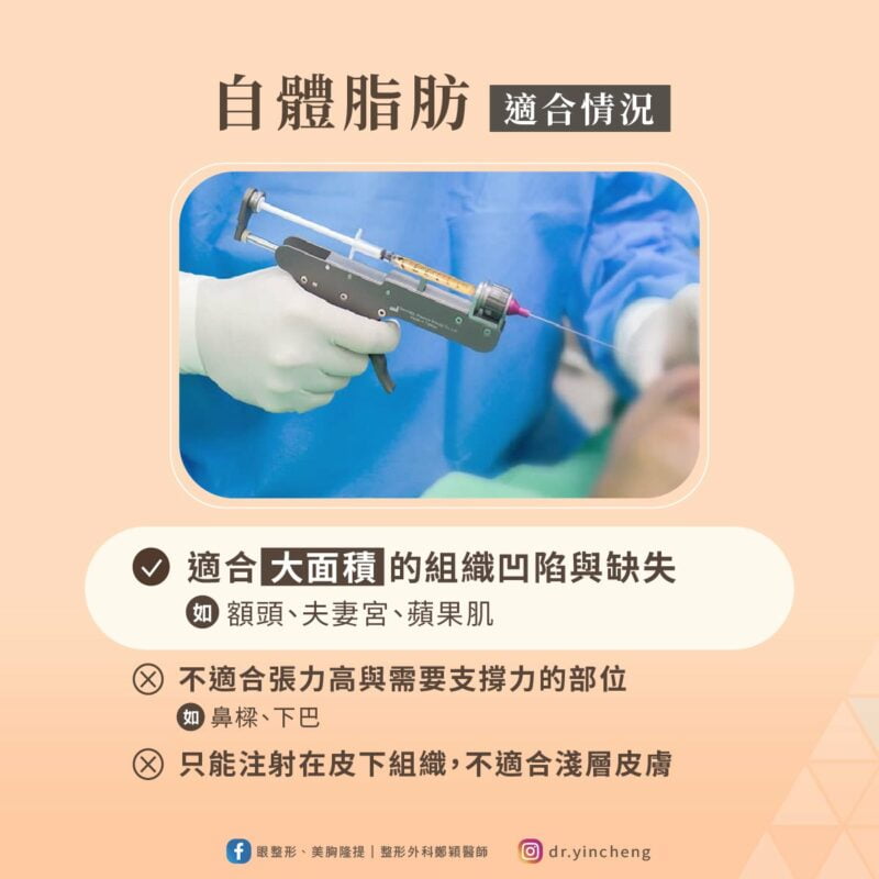 - 自體脂肪質地柔軟、相容性高,適合“大面積的組織凹陷與缺失“,因此適合填補在額頭、夫妻宮、蘋果肌等大範圍面積的填補,能夠為臉部的線條做好打底,達到整體澎潤的效果,但不適合填補在張力高與需要支撐力的部位(例如鼻樑、下巴等等)與淺層皮膚。