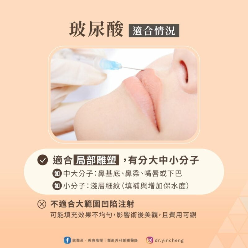 - 玻尿酸則適合部“局部的雕塑”,其本身有大中小分子的種類,以應映個案不同的臉部狀況,中大分子支撐力強適合填補在鼻基底、鼻梁、嘴唇或下巴,達到更堅挺持久的「塑形」效果,突顯立體線條,若是小範圍的臉頰凹陷,又不想要手術恢復期,也很適合用玻尿酸修飾。而淺層細紋則可以利用小分子玻尿酸注射在真皮層做填補與增加皮膚保水度。若是大範圍凹陷注射玻尿酸,就有可能因為填充效果不均勻,影響術後美觀,並且費用會相當可觀。