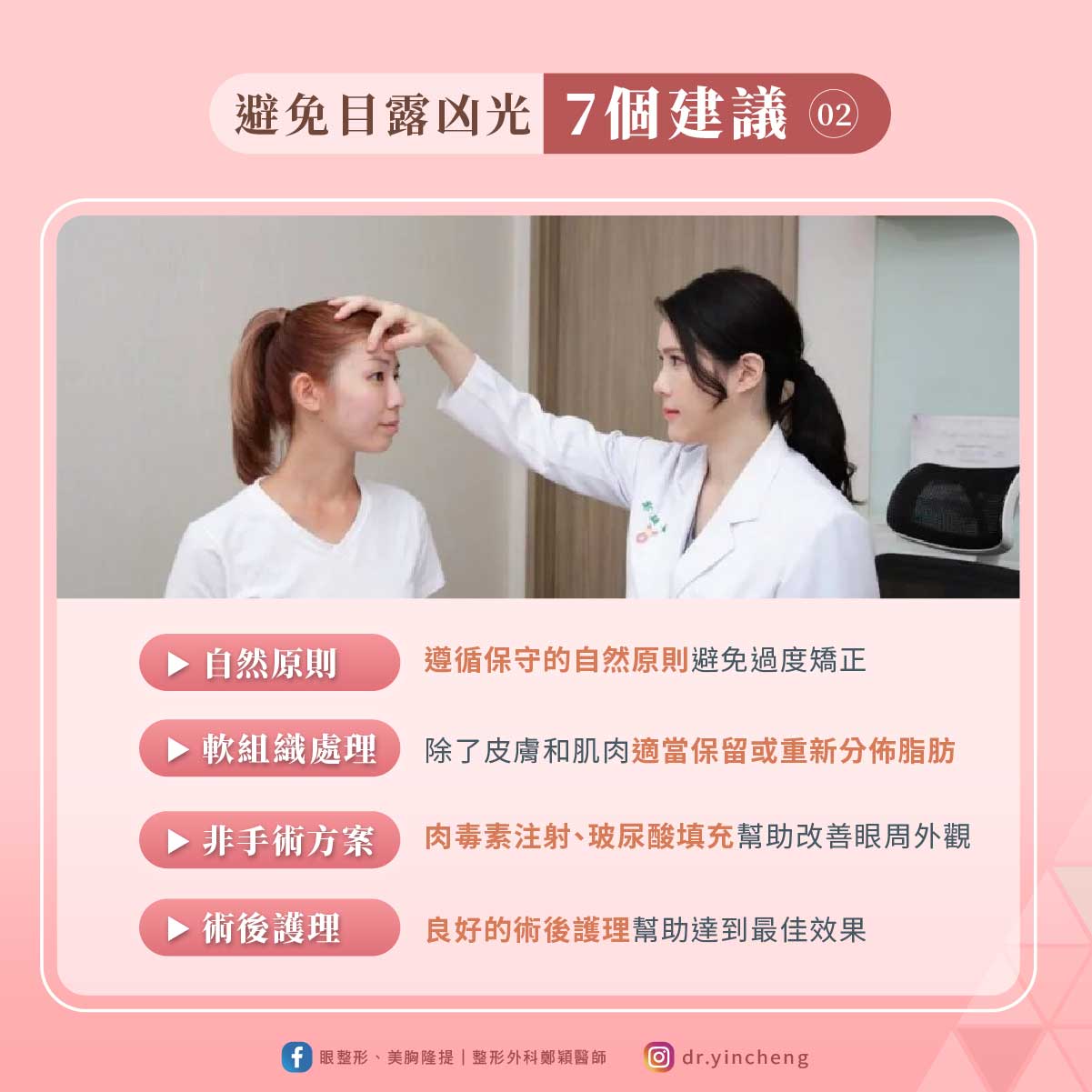 ▶自然原則:在進行手術時,應遵循保守的自然原則。過度矯正往往會帶來不自然的效果,反而可能加重「凶光」問題。